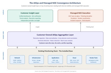 Figure 1. The AIOps and managed NOC convergence architecture. The customer-owned insight layer sits on top of the existing tool stack and feeds both internal visibility and managed NOC execution.